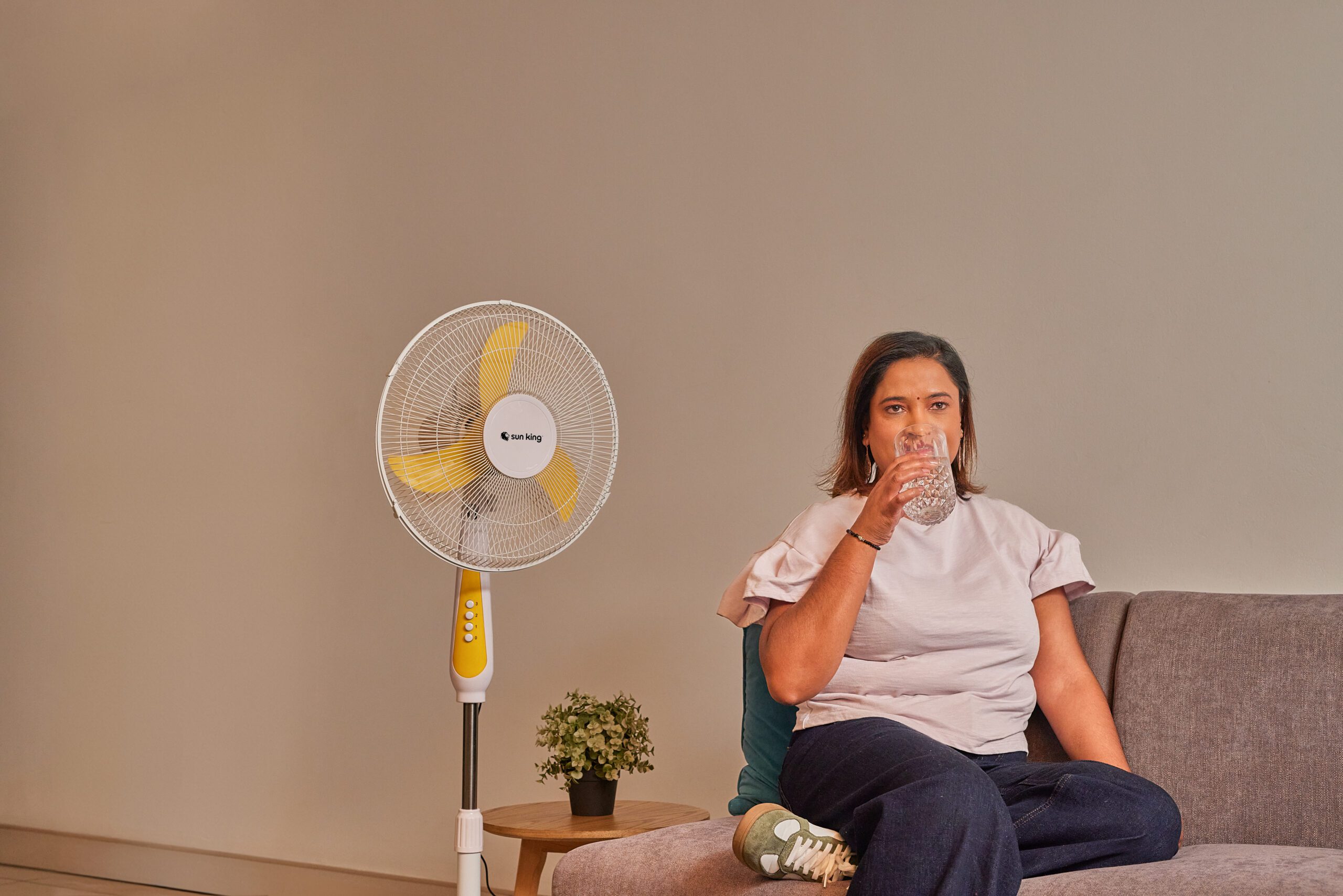 The Sun King Pedestal Fan is a versatile option for cooling your home or workplace. It is equipped with three fan speed modes and uses a Brushless DC Motor (BLDC) for quick, quiet, and efficient cooling.
